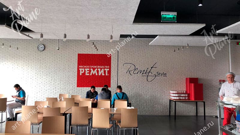 К нам обратился Антон – Арт-директор мясного производства «Ремит», необходимо было нанести логотип в новой столовой на производстве «Ремит», как раз там выполнялись ремонтные работы.